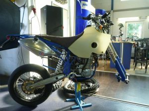 Vorgabe: Großer Haupttank aus Schweden geordert( knapp 15 Liter), Felgen Excel Dirt Star in schwarz V&H, Bremse vorn umbauen auf Vierkolbenzange, meinen Seitentank (einer von drei gebauten), Rally Cockpit, Garmin 278 mit Halter von Touratech, Übersetzung 15X 48 Ketterad selbstvertändlich Stealth in Blau, Schalldämpfer Acrapovic Racing, Großer Motorschutz OEM Husaberg, Reifen T63 V/H, Sitzbank hoch, Bezug Alcantara/ Blau und mal sehen was noch so schickes passt…